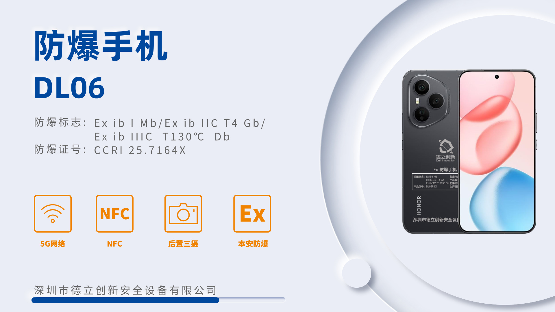 描述:防爆手机DL06 采用本安防爆技术,防爆标志:Ex ib I Mb/Ex ib IIC T4 Gb/Ex ib IIIC T130℃ Db通过化工防爆安全认证。可在化工1区、2区危险环境中使用。4G/5G网络,移动/联通/电信全网通用,双卡双待八核CPU。