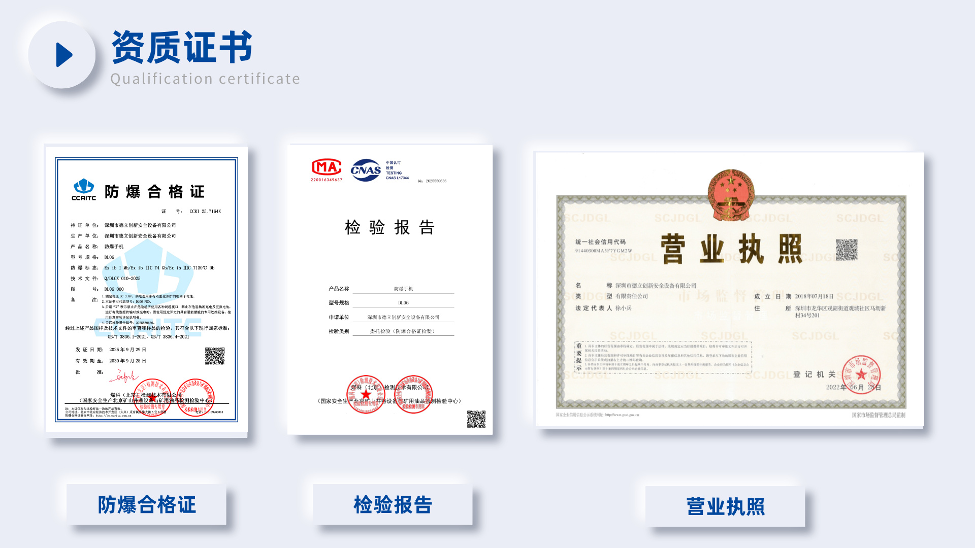 描述:防爆手机DL06 采用本安防爆技术,防爆标志:Ex ib I Mb/Ex ib IIC T4 Gb/Ex ib IIIC T130℃ Db通过化工防爆安全认证。可在化工1区、2区危险环境中使用。4G/5G网络,移动/联通/电信全网通用,双卡双待八核CPU。